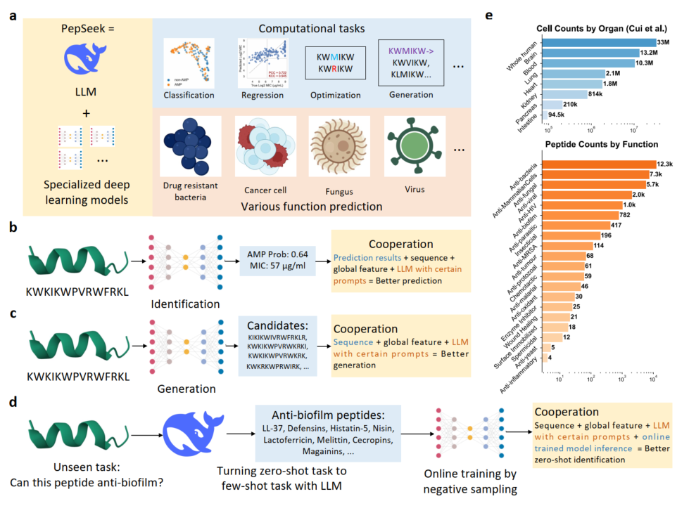 PepSeek技术由山东大学的李延青等人牵头,基于大语言模型和专门深度学习模型的协同,旨在解决肽段数据稀缺和”域外”泛化问题。前者具有强大的推理能、后者具有高精度预测能力,因此该框架理论上对于肽段识别、生成和优化等多重任务是通用的。