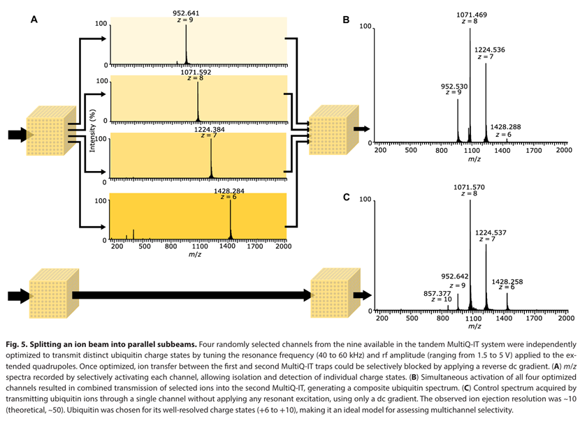 大规模并行的离子分束:MultiQ-IT 还可以作为分流器,通过对特定出口通道施加共振频率激发,将一束混合离子同时拆分成多个具有特定质荷比范围的子光束。这意味着,非共振的离子会被弹回阱内继续寻找自己的“专属通道”,而选定的多束离子可以同时进入下游的并行质量分析器中。这为未来打造拥有多个同时运作分析通道的质谱仪奠定了硬件概念基础。